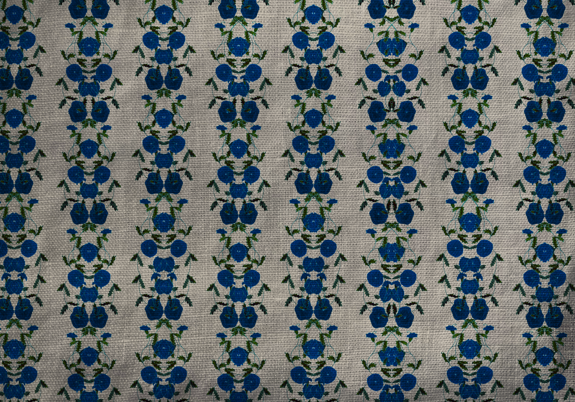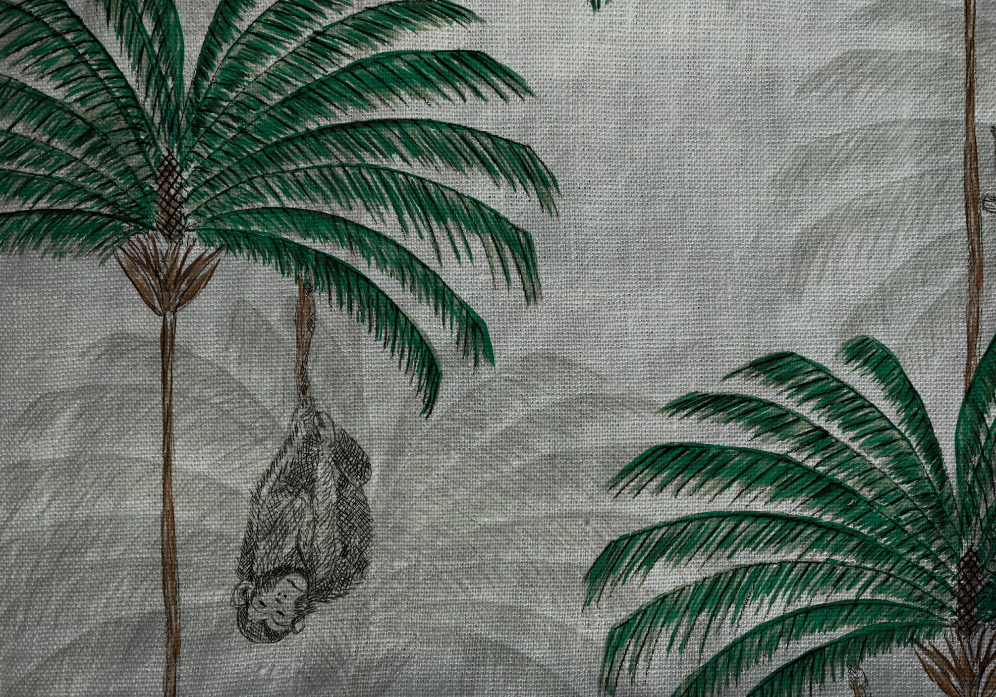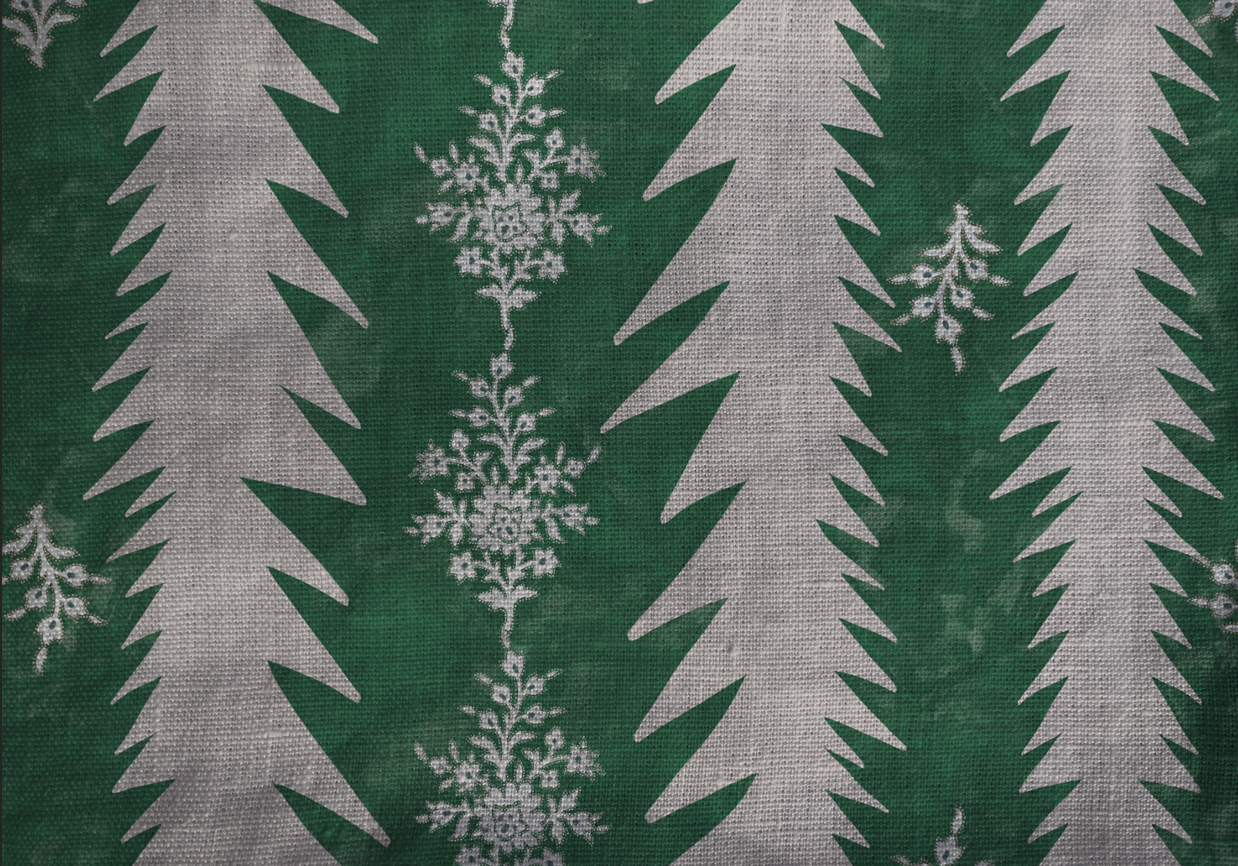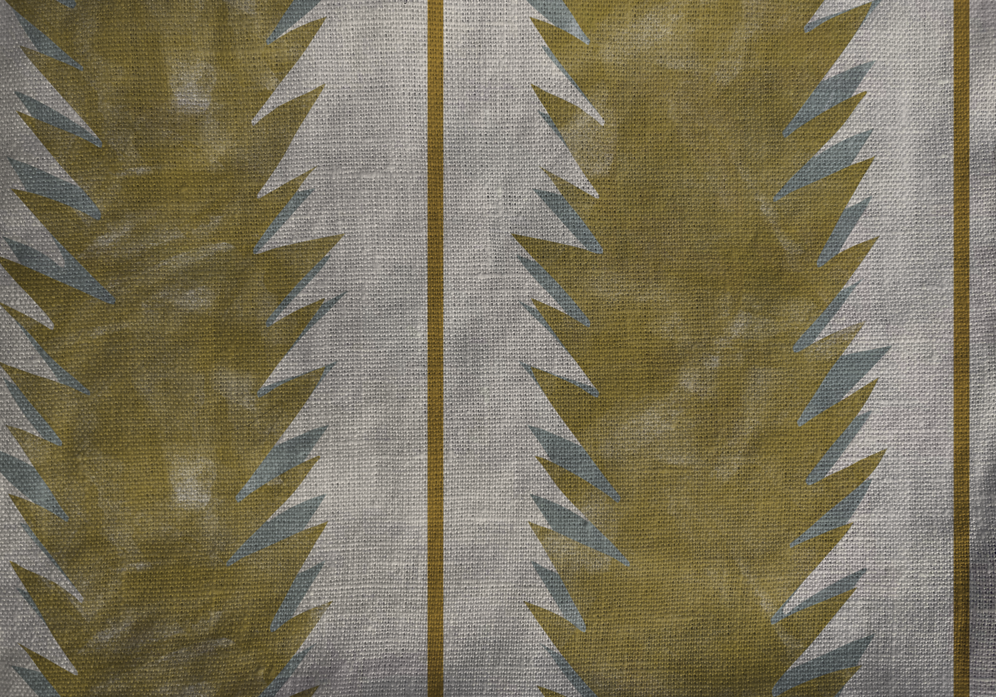 It brings together waves, geraniums, citrus trees, stripes and woven textures — interpreted through hand-drawing and collage. Designed to create balance and warmth in any space, the collection is printed sustainably in Europe on linen and wallpaper, and made to order.