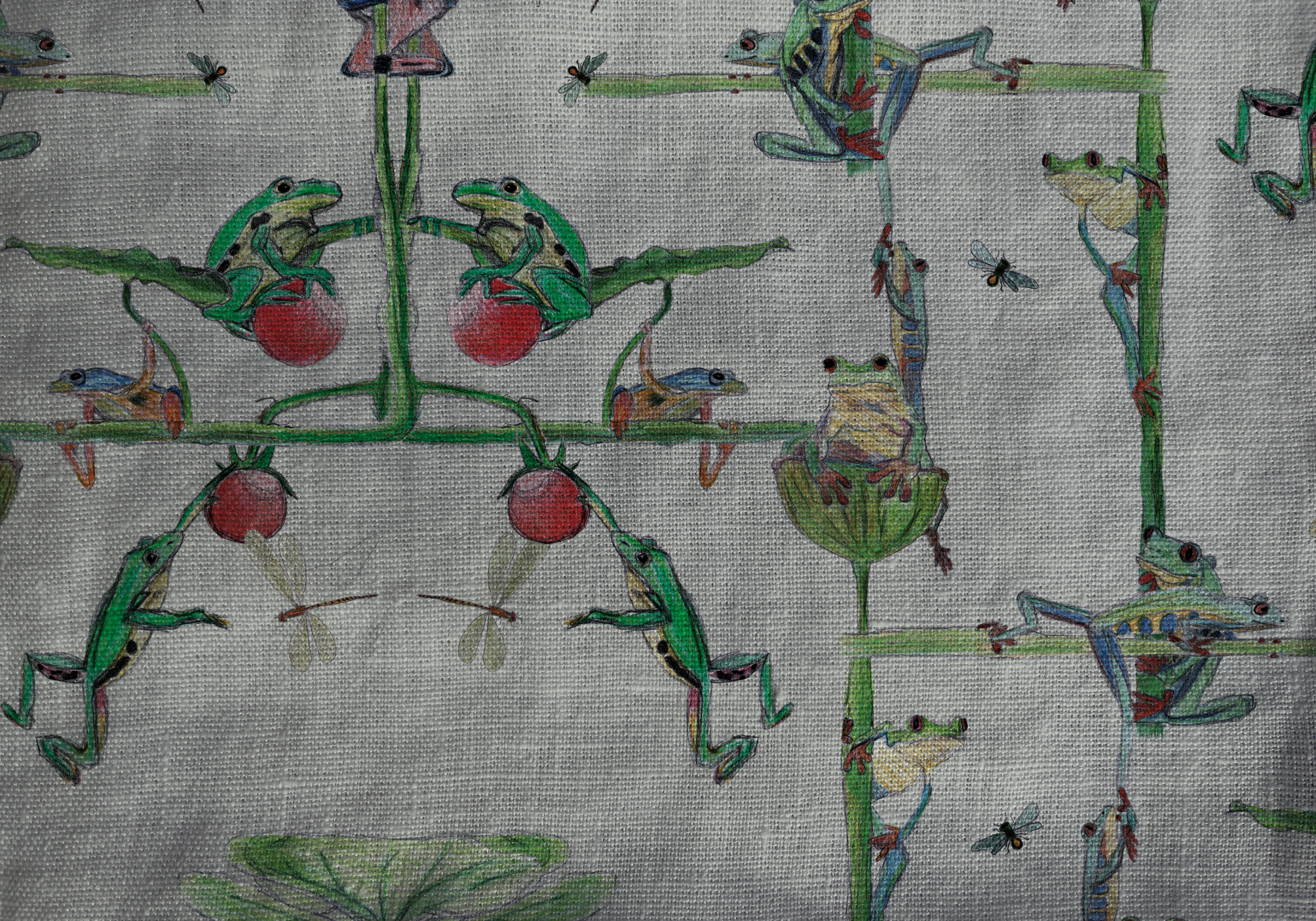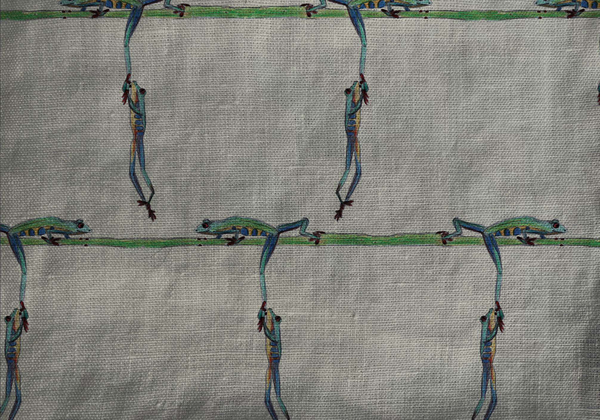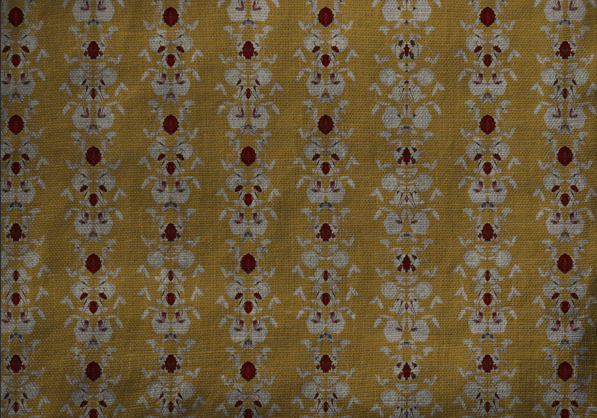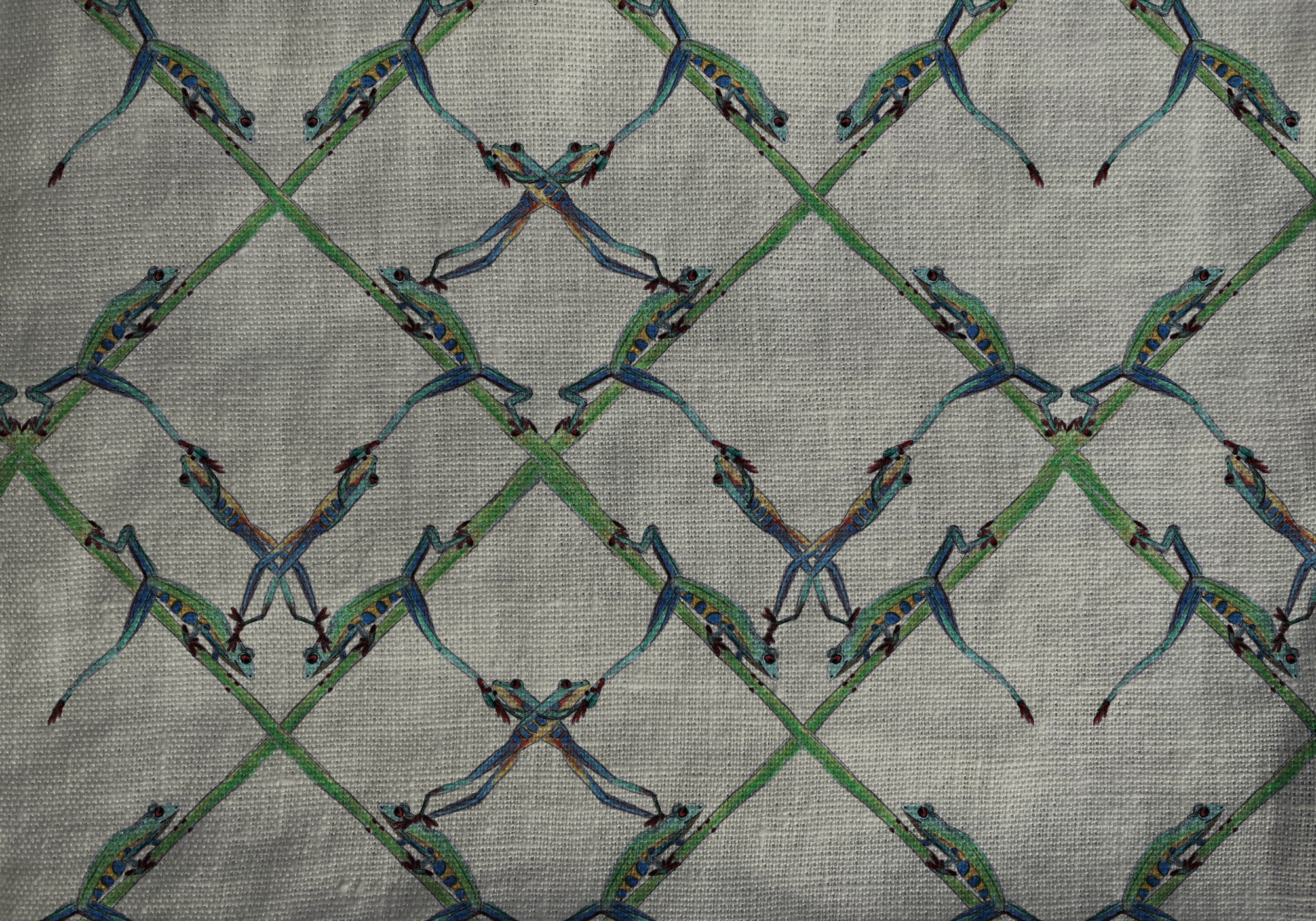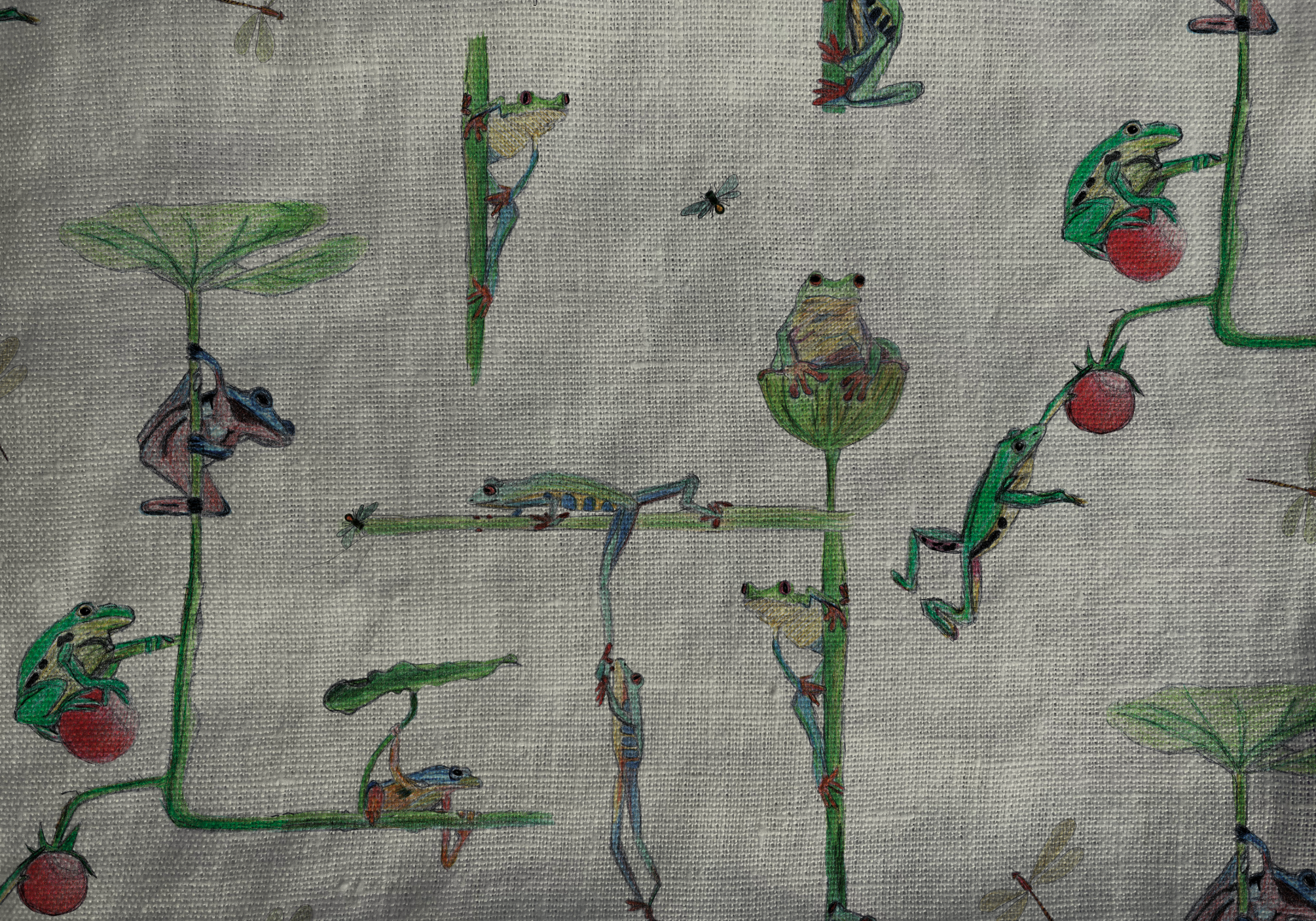 It brings together waves, geraniums, citrus trees, stripes and woven textures — interpreted through hand-drawing and collage. Designed to create balance and warmth in any space, the collection is printed sustainably in Europe on linen and wallpaper, and made to order.