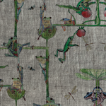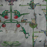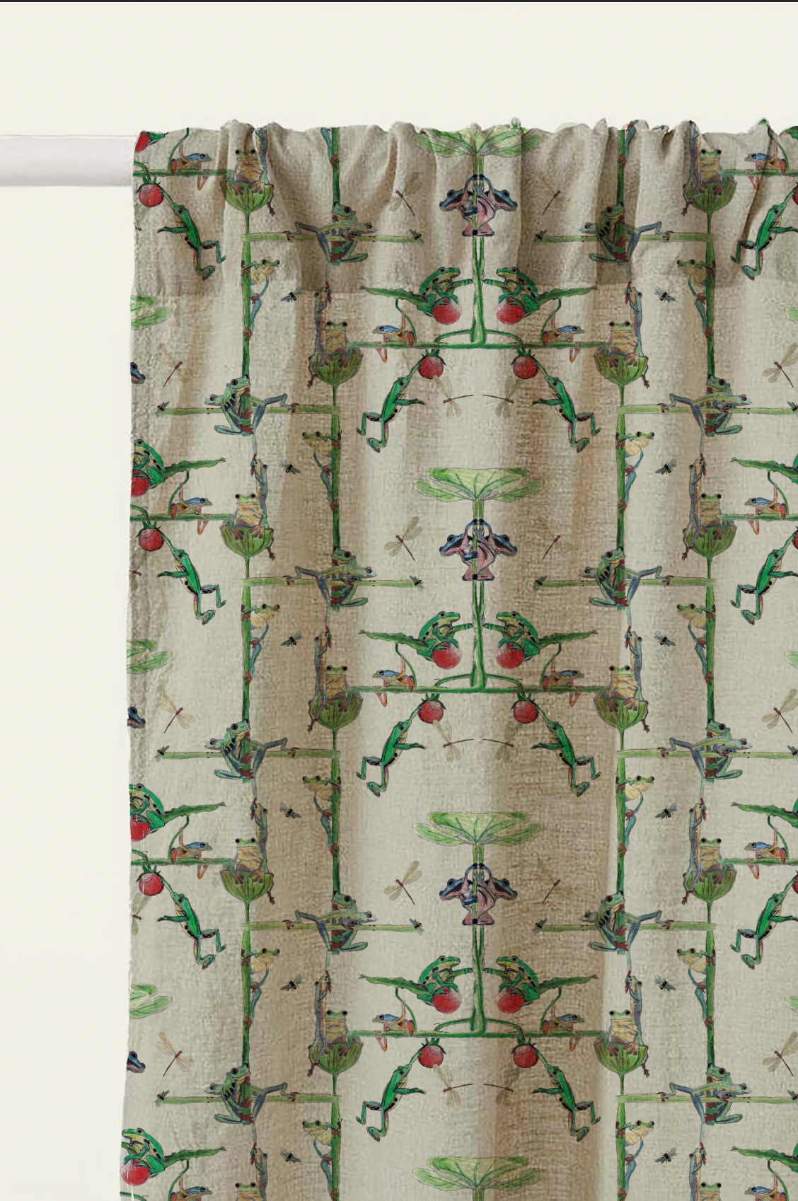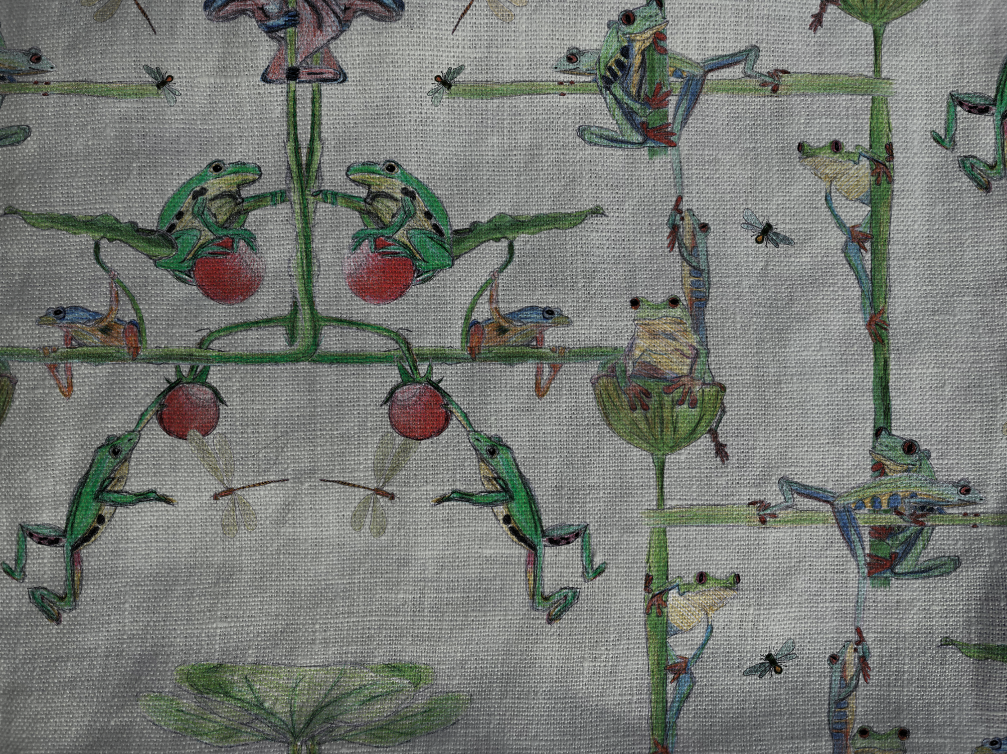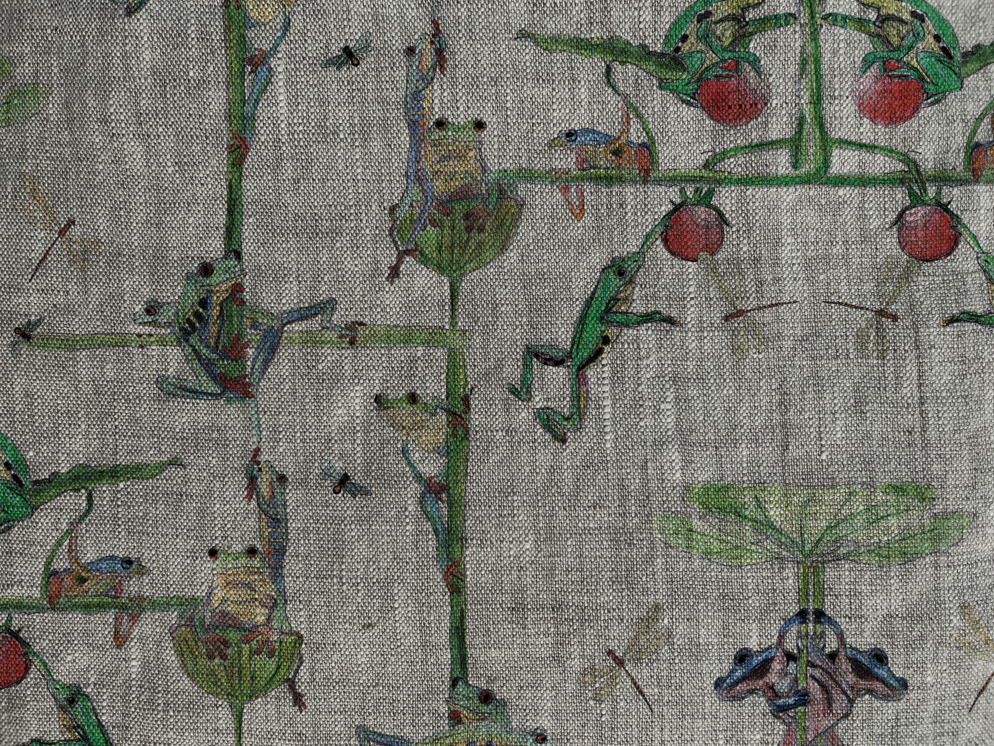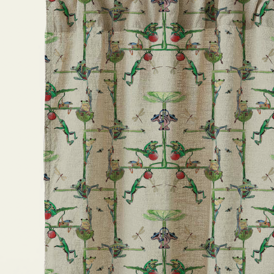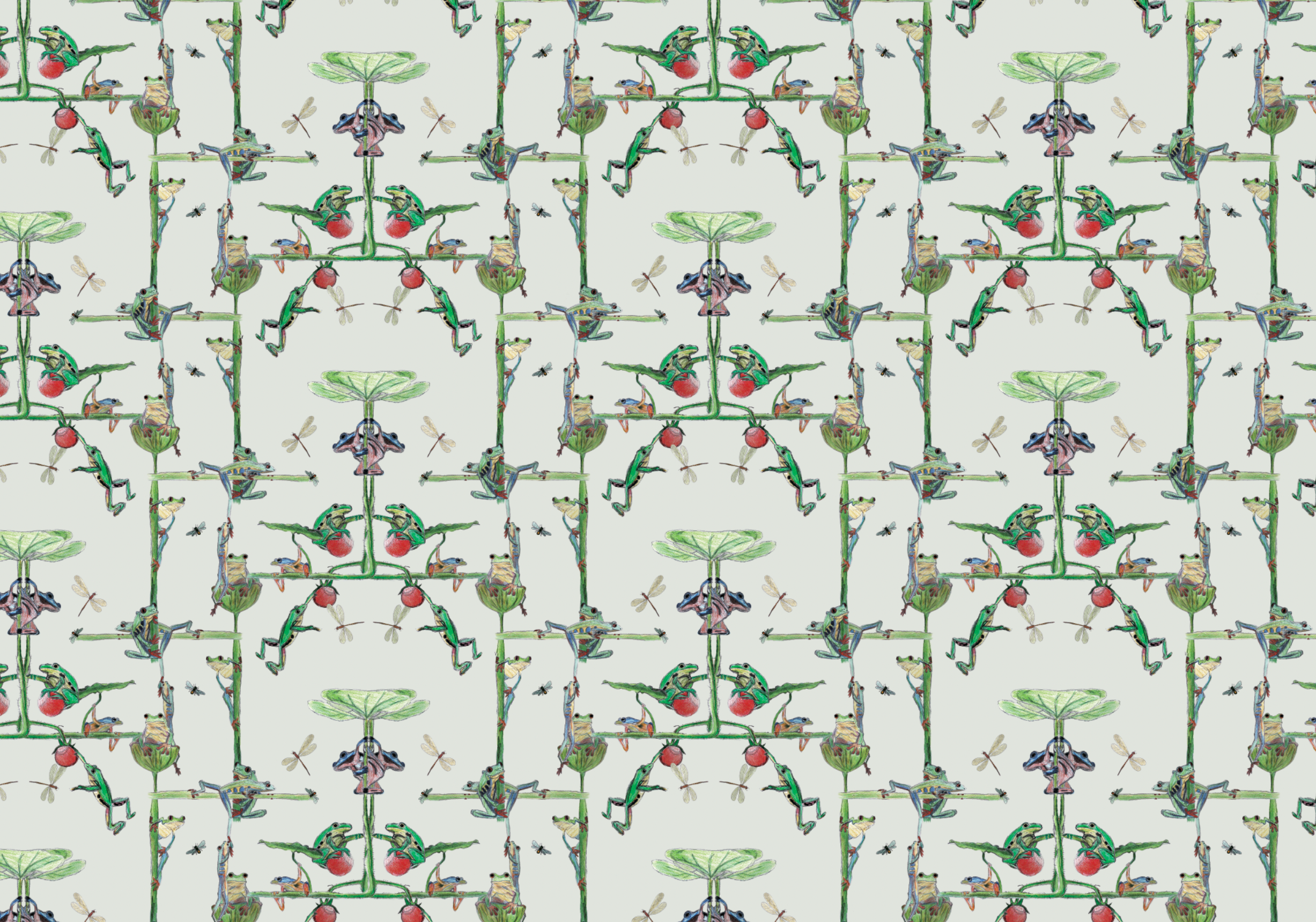 Brink pattern, a charming and playful design for wallpaper and linen featuring a frog print. The design consists of small branches from which frogs are hanging, creating a delightful scene that will bring a touch of nature and whimsy to any space.