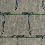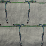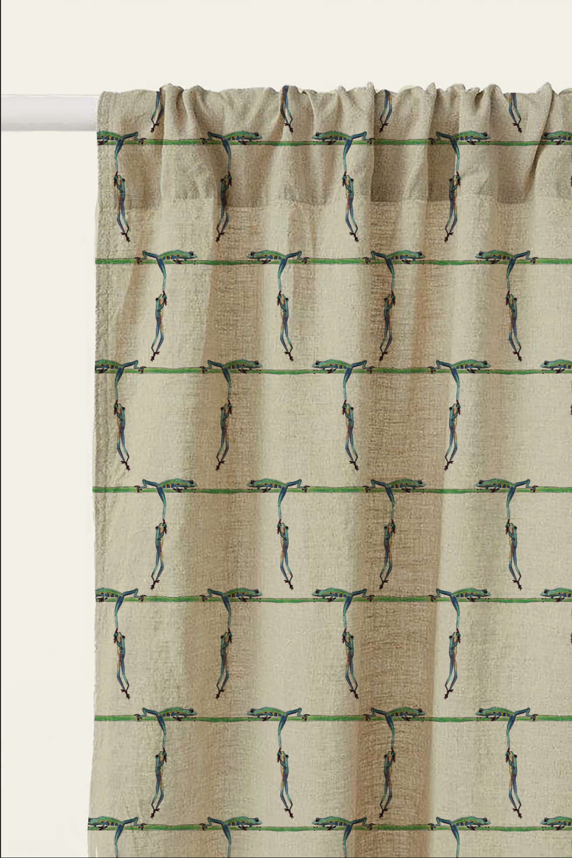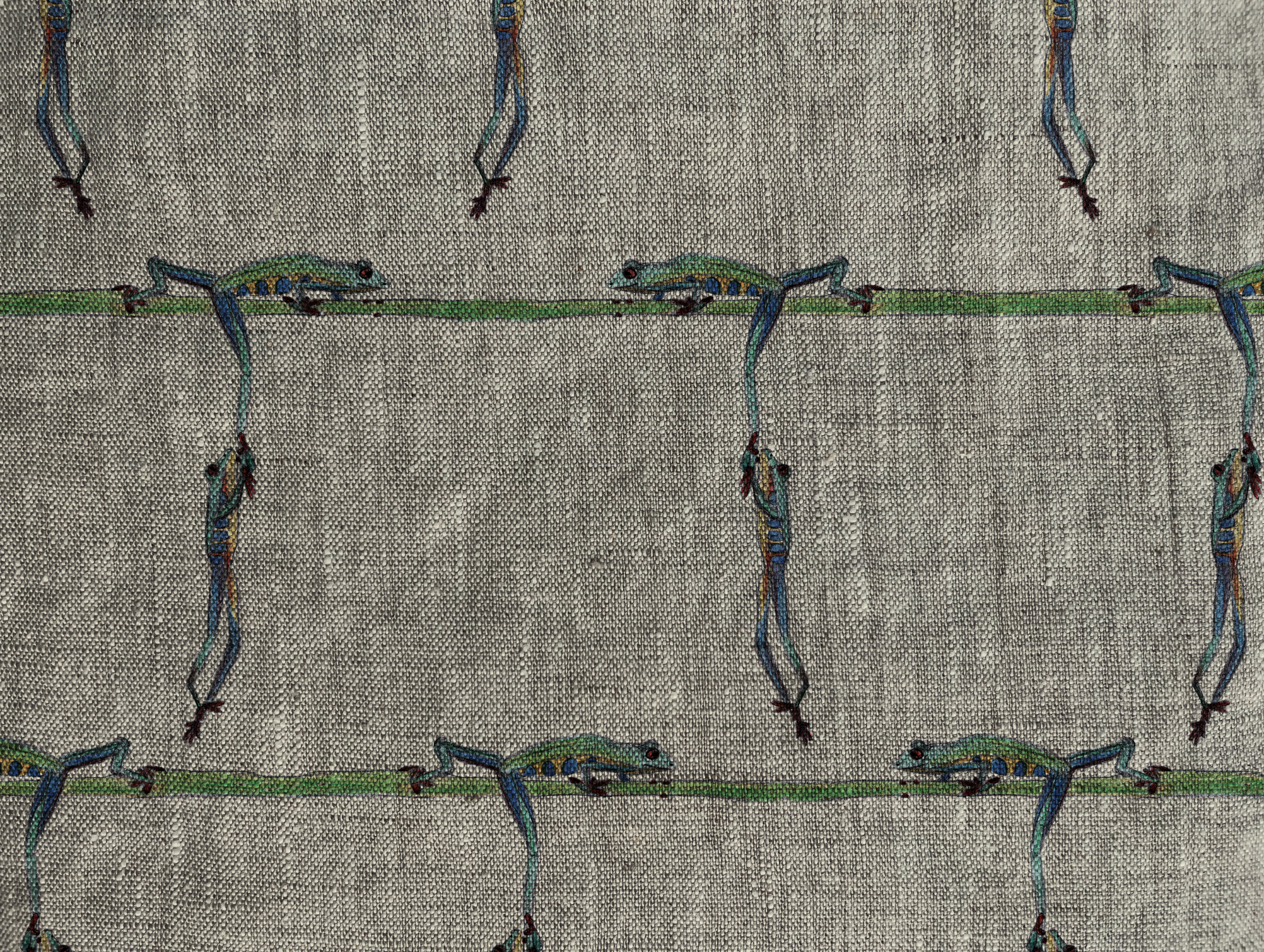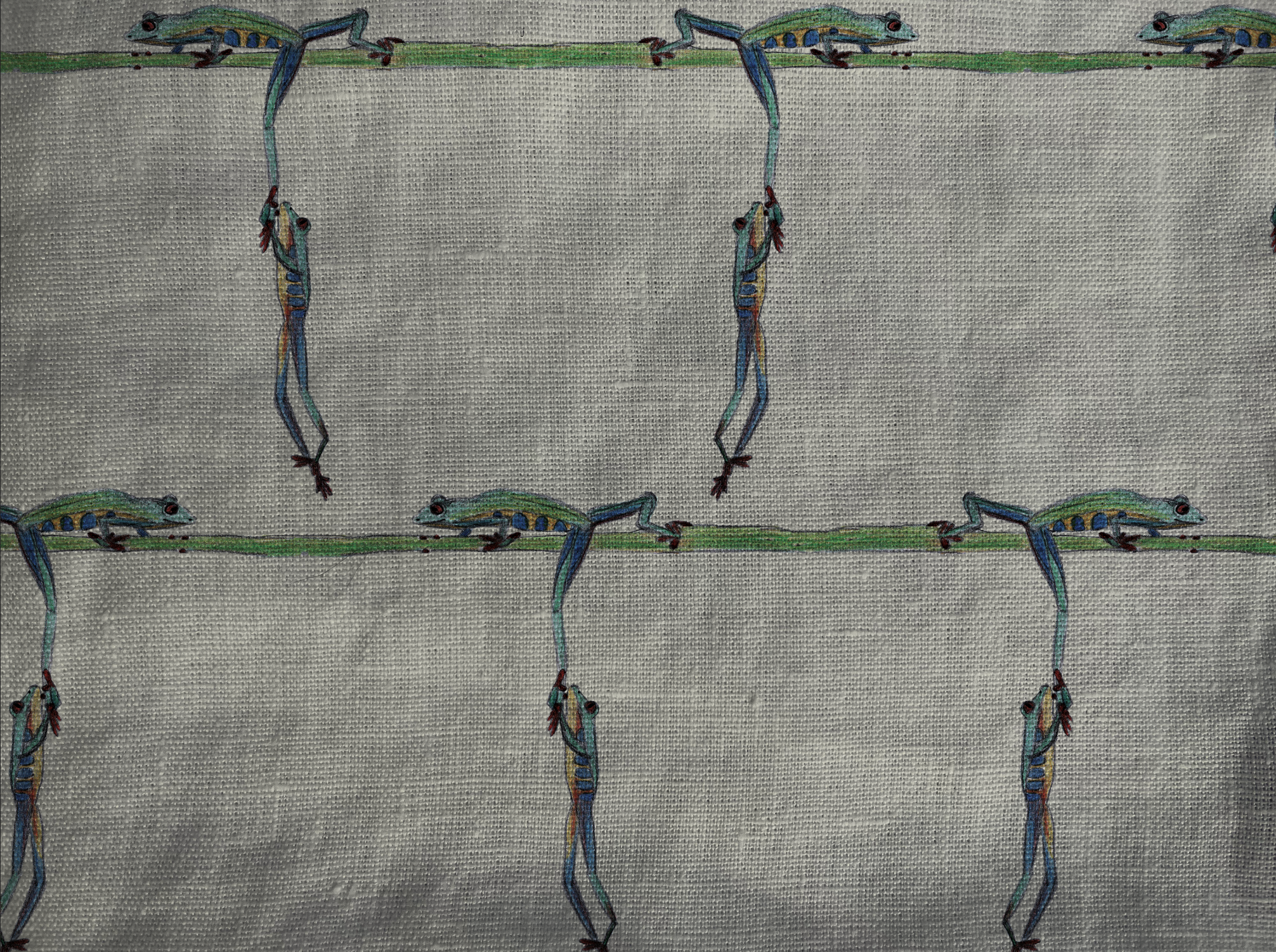 Brink pattern, a charming and playful design for wallpaper and linen featuring a frog print. The design consists of small branches from which frogs are hanging, creating a delightful scene that will bring a touch of nature and whimsy to any space.