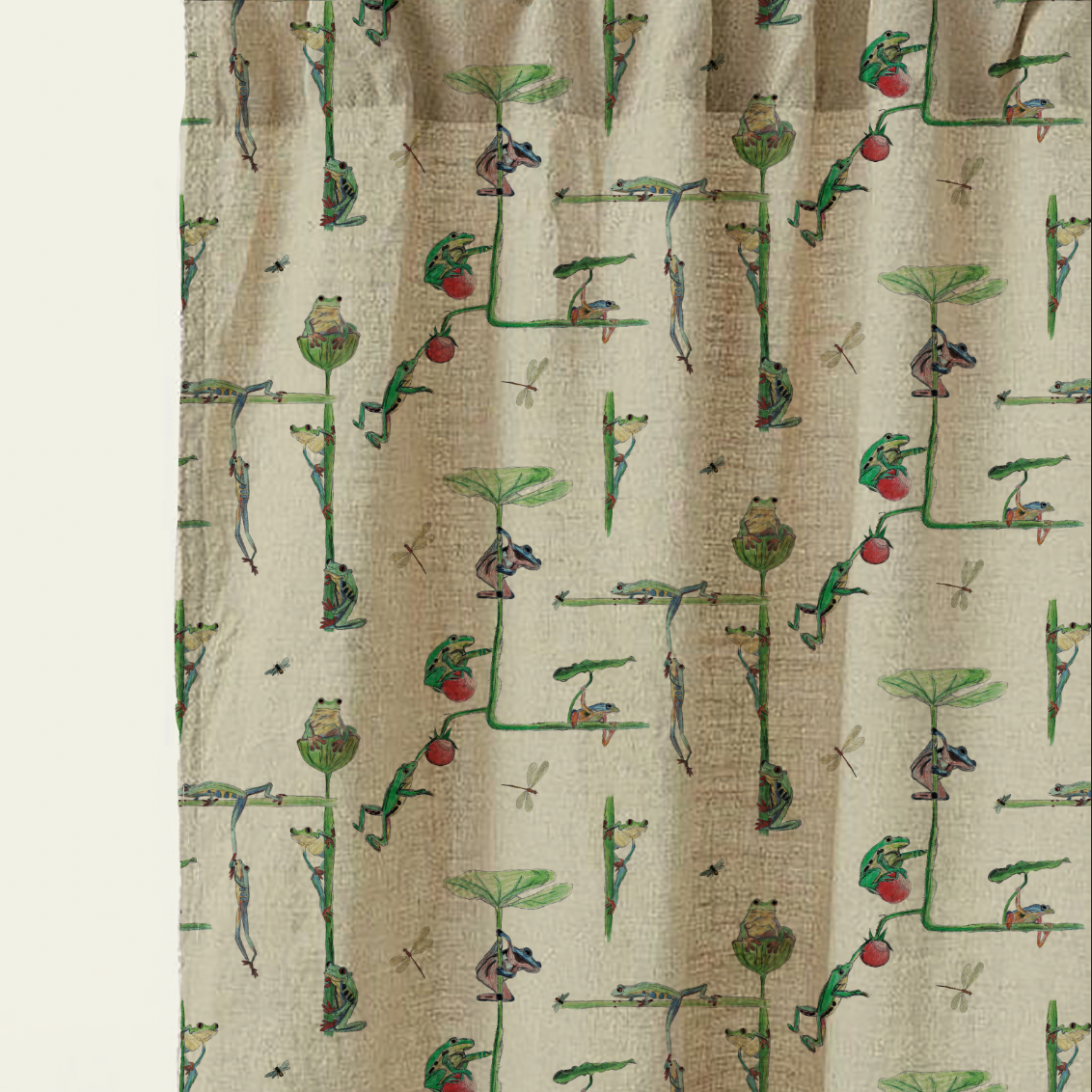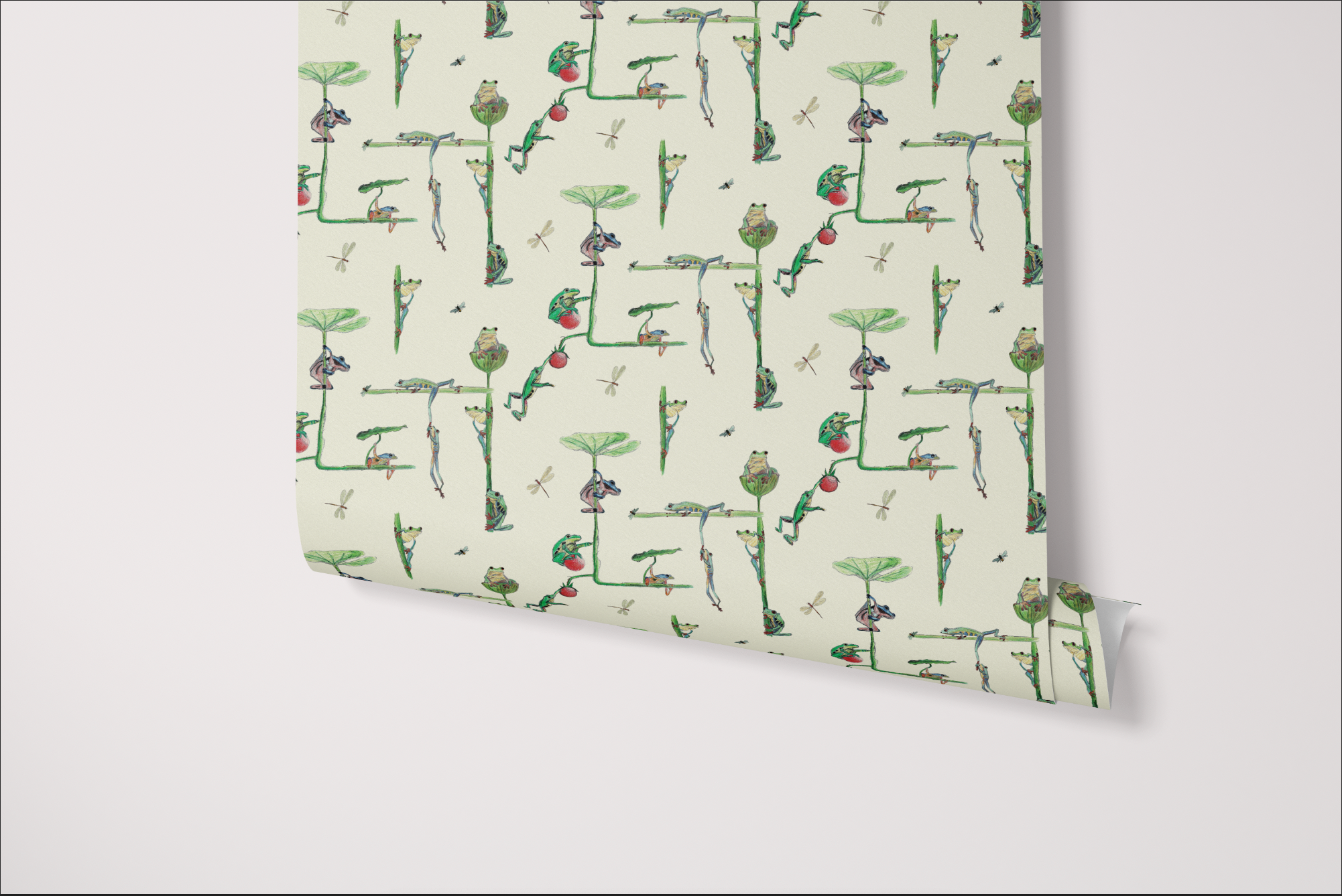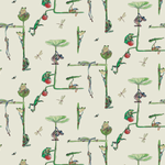Brink pattern, a charming and playful design for wallpaper and linen featuring a frog print. The design consists of small branches from which frogs are hanging, creating a delightful scene that will bring a touch of nature and whimsy to any space.