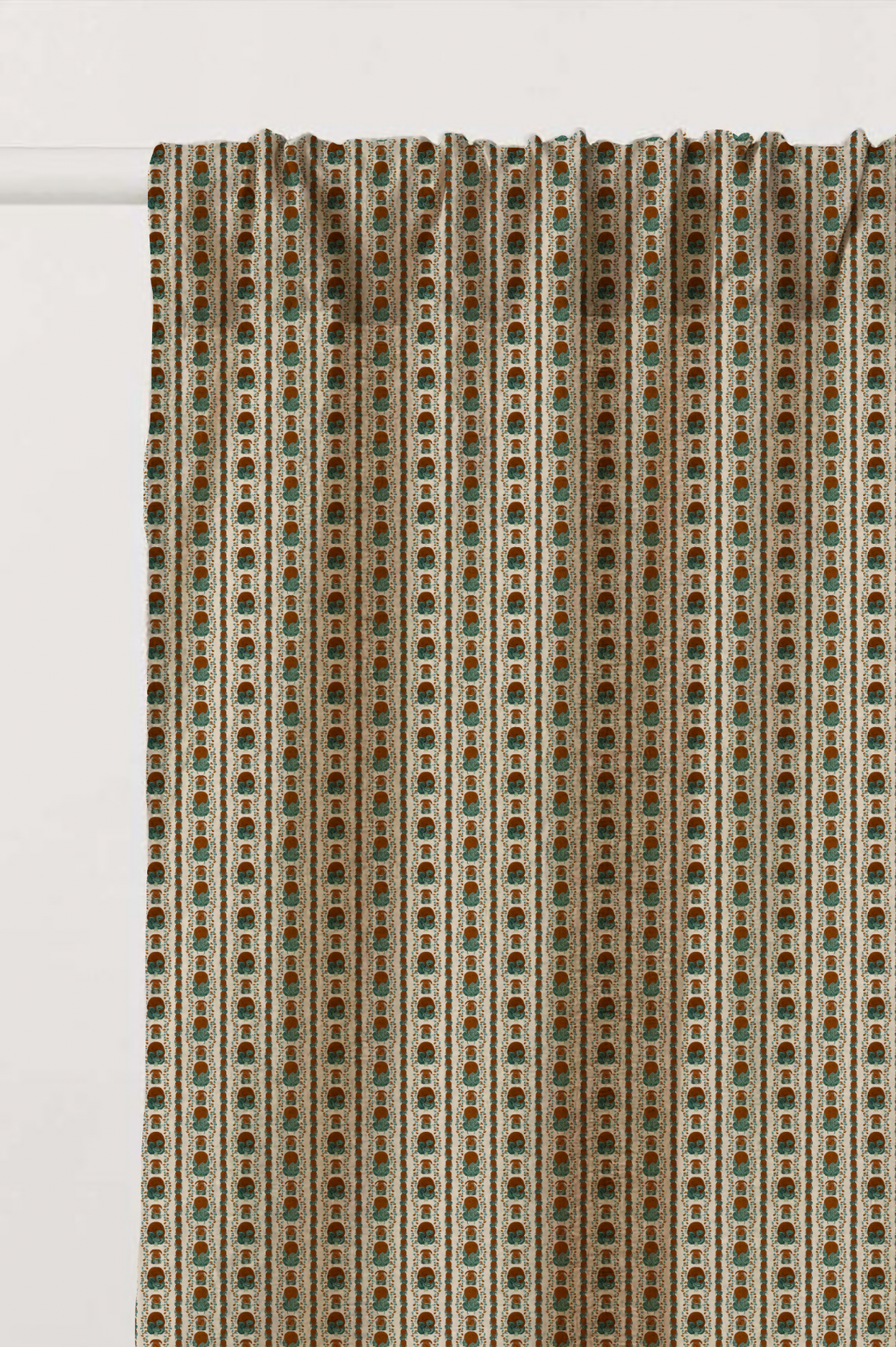 Introducing Mini Geranium, a delicate reinterpretation of our larger Geranium pattern, scaled down for a more intricate, decorative effect. This charming vertical stripe features stylised floral forms that recall antique textiles and Mediterranean garden borders. Ideal for smaller surfaces, cushions or coordinated details, Mini Geranium offers richness in a more subtle format. Available in Clay, Crimson, Cobalt, and Saffron. If you need to see a sample, send us an email at info@delacovadesign.com.