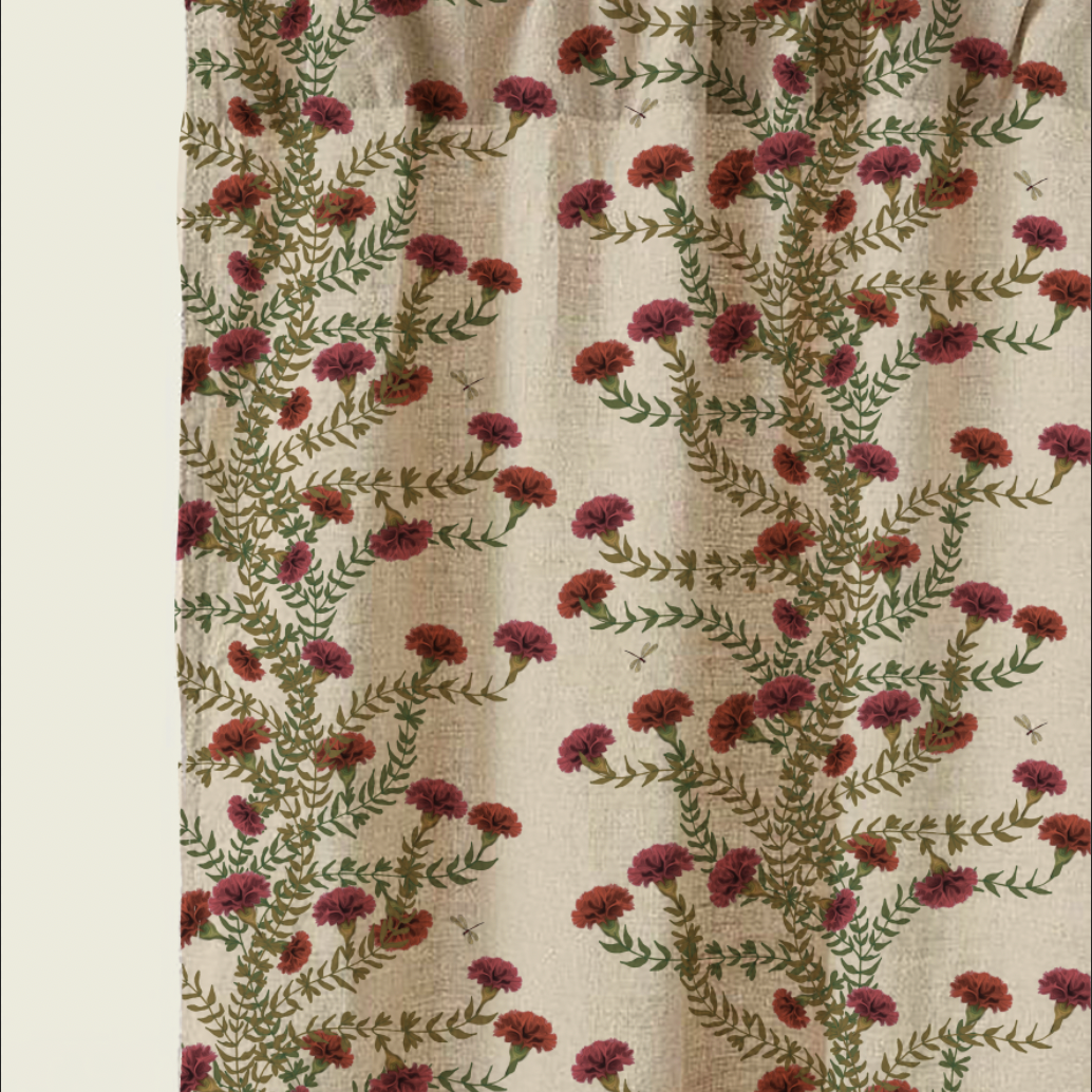 "Sielalla," a whimsical dance of carnations and fireflies, ascending in a magical way, weaving a tale of enchantment and wonder. Each pattern reflects the designer's passion for Sevilla, bringing to life the charm of this vibrant city in every petal and glow.